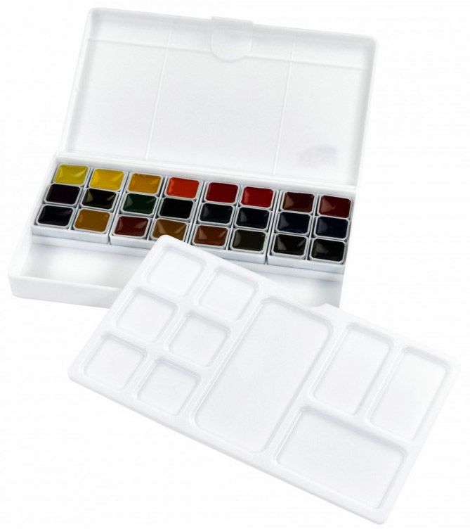 La caja de acuarelas ROSA Studio contiene 24 pastillas formato media godet, elaboradas con colores tradicionales de la acuarela. La mayoría de las pinturas del set son de un solo pigmento, lo que permite aprender y experimentar con la mezcla.