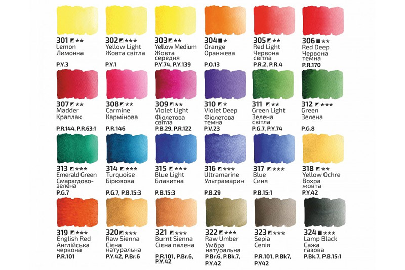 301 – Lemon, 302 – Yellow Light, 303 – Yellow Medium, 304 – Orange, 305 – Red Light, 306 – Red Deep, 307 – Madder, 308 -Carmine, 309 – Violet Light, 310 – Violet Deep, 311 – Green Light, 312 – Green, 313 – Emerald Green, 314 – Turquoise, 315 – Blue, 316 – Ultramarine, 317 – Blue, 318 – Yellow Ohre, 319 – English Red, 320 – Raw Sienna, 321 – Burnt Sienna, 322 – Raw Umber, 323 – Sepia, 324 – Lamp Black