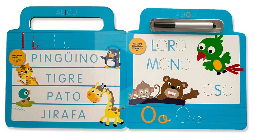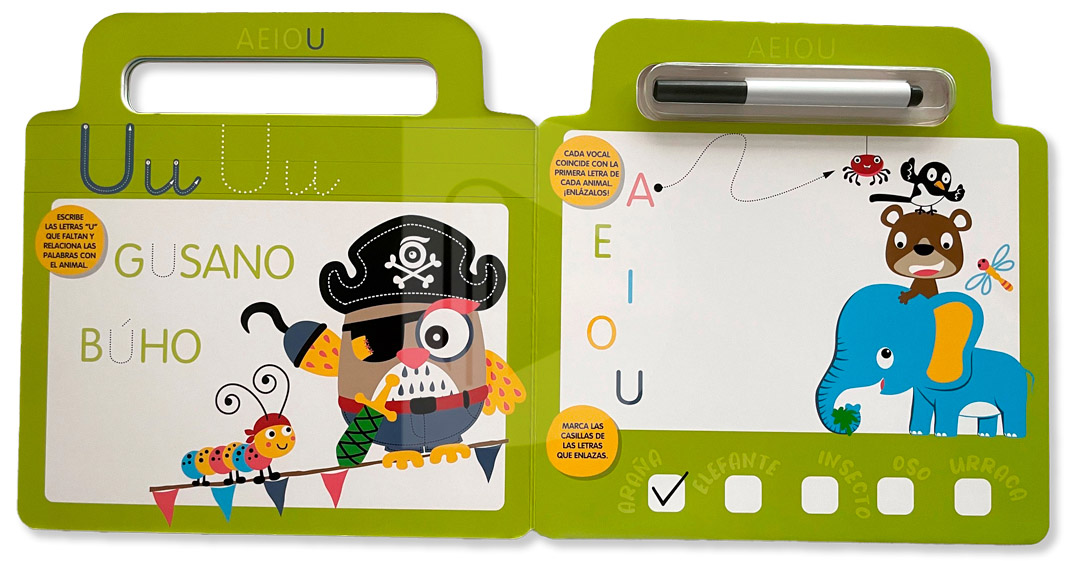 Divertidas actividades para aprender a escribir. Escribe y borra con el rotulador incluido.