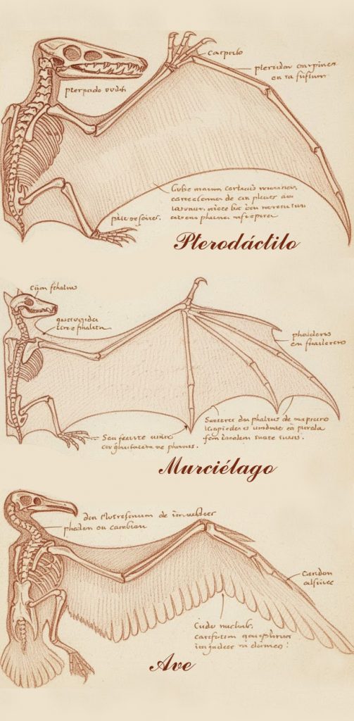 Cambio de plan, hay que pensar a lo grande: Anatomía de los Pterodáctilos. Algo habrá, seguro, es lo que tiene internet. Y te encuentras con que tenían buenos hombros, pero las alas… ¡Qué desastre! Las alas se formaban a partir de un único dedo. Así que vuelves a la foto anterior del murciélago zorro, porque esas sí que son unas bellas alas correosas con cuatro dedos.